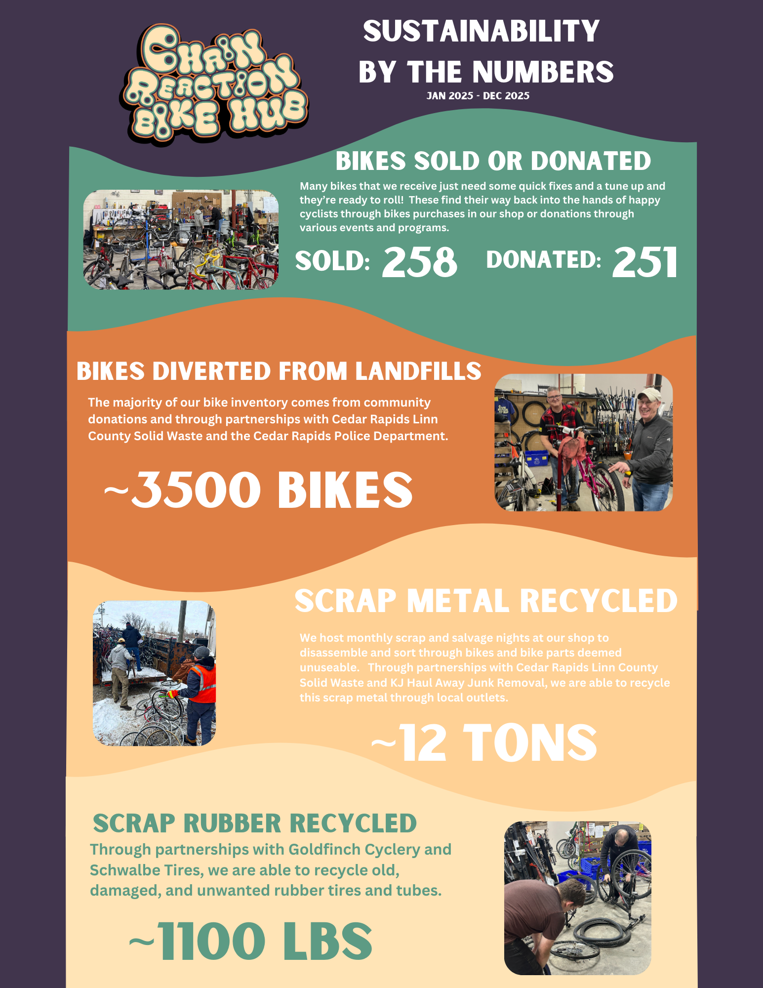 Our commitment to sustainability touches all aspects of our organization. We’re dedicated to diverting bikes from landfills and giving them a second lease on life. We’ve also implemented several programs and processes to reuse and recycle bike parts and scrap materials. All donations we receive will either find a home at our shop, in the hands of a happy cyclist, or properly recycled.